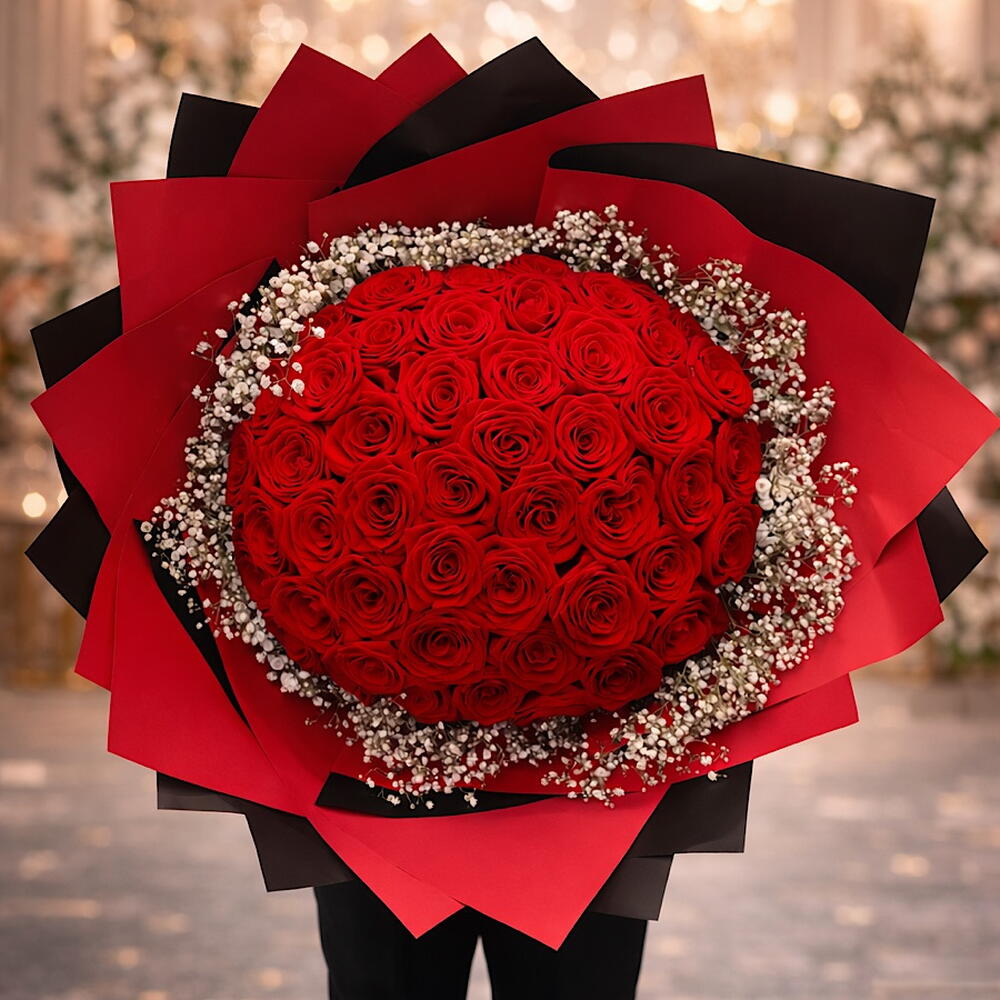 Scarlet Embrace is the warmth of a deep connection captured in flowers. Each red rose speaks of love, devotion, and intensity, while the soft white accents add purity and tenderness. Created for moments when emotions are strong, sincere, and unforgettable.
