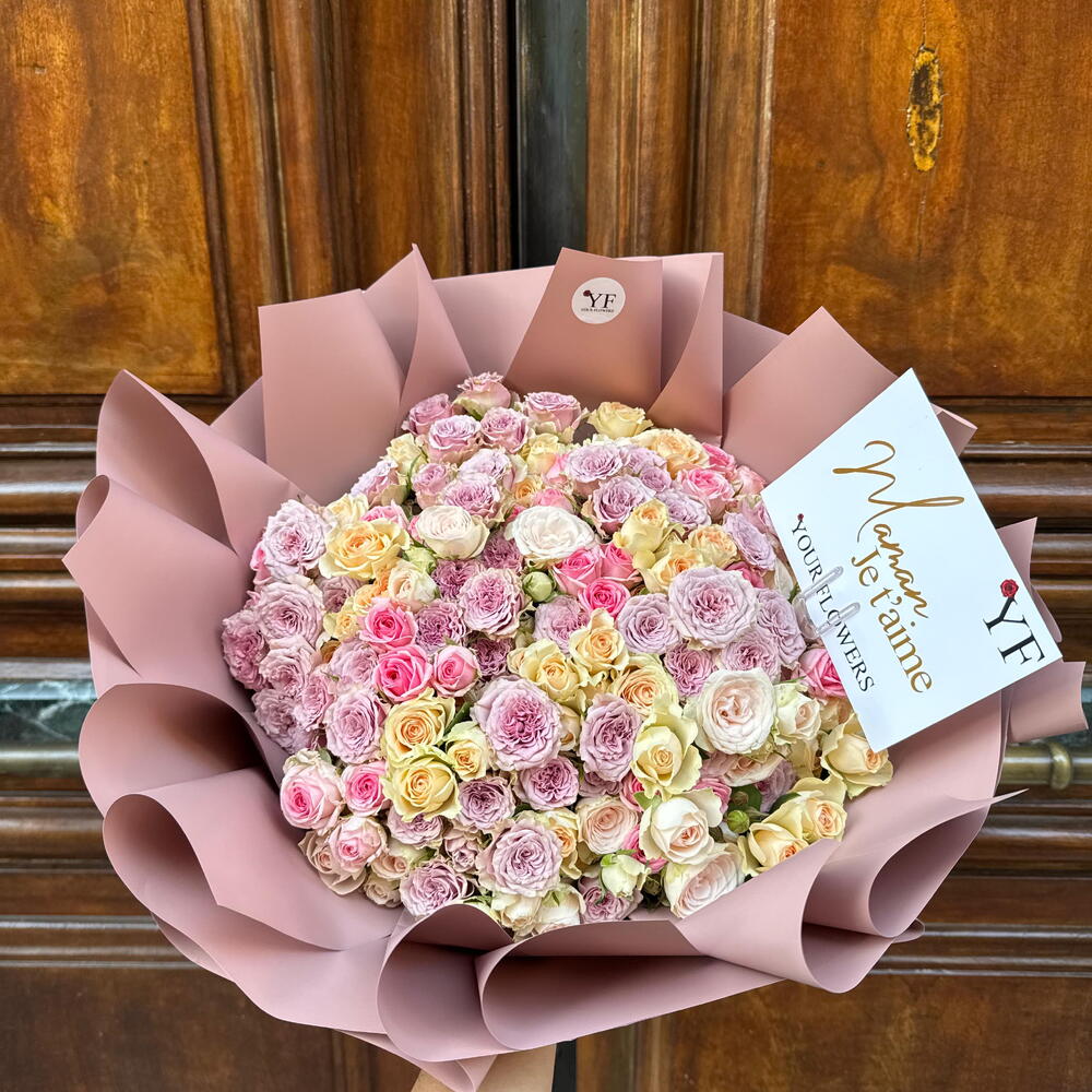 Ce bouquet spectaculaire séduit par son abondance de roses délicates aux nuances poudrées de rose, crème et ivoire, créant une harmonie douce et luxueuse. Il convient parfaitement pour un anniversaire, un mariage, des fiançailles, une demande en mariage, la Saint-Valentin, ou encore pour célébrer un événement important de la vie. Ce bouquet est également un choix élégant pour exprimer l’amour, la gratitude ou l’admiration lors d’une occasion professionnelle ou personnelle. Chaque rose est soigneusement sélectionnée pour sa fraîcheur et sa texture veloutée, tandis que l’emballage moderne souligne le caractère premium de la composition. Pour prolonger la beauté du bouquet, placez-le dans un endroit frais, à l’abri du soleil direct et des courants d’air. Changez l’eau tous les deux jours et recoupez les tiges en biais sur 1–2 cm. Retirez régulièrement les feuilles immergées afin de préserver la fraîcheur des fleurs.