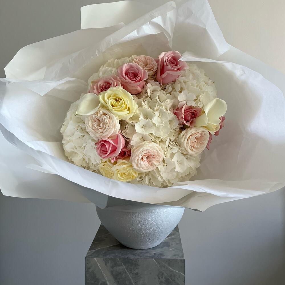 roses - 15 pce ruban satiné - 1 pce hortensias blanches - 5 pce carte - 1 pce
