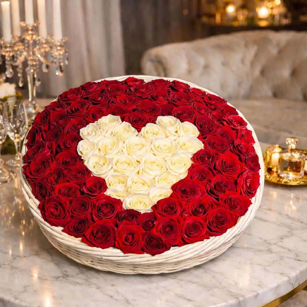 Celebrate love with timeless elegance through The Eternal Heart Basket, a breathtaking floral masterpiece crafted for Valentine’s Day. This luxurious round basket is filled with velvety deep red roses, beautifully highlighting a radiant heart of pure white roses at its center — a symbol of passion, devotion, and everlasting love. Designed for those who appreciate refinement and exclusivity, this arrangement brings a warm, glamorous touch to any romantic setting and makes an unforgettable statement of luxury.