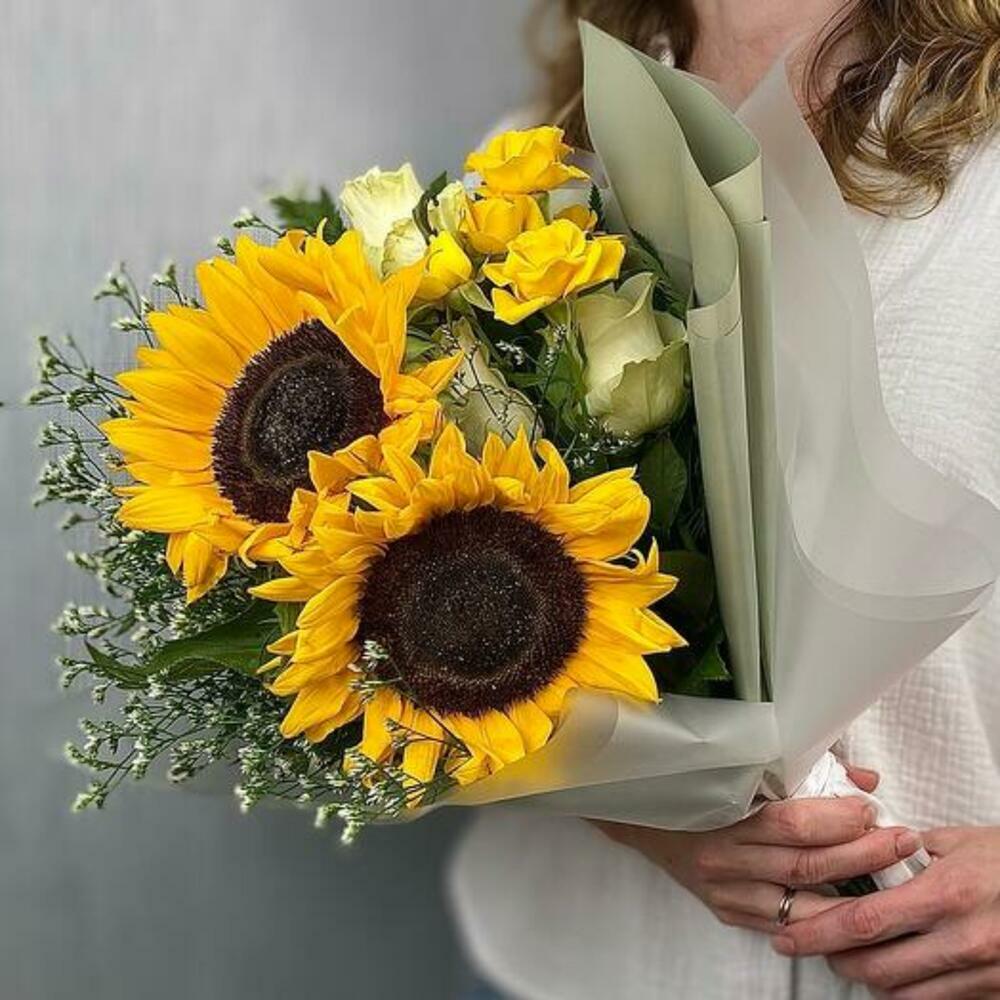 Un bouquet radieux qui capture lessence du soleil, composé de majestueux tournesols, de délicates roses blanches et jaunes, et de touches de feuillage qui rehaussent sa fraîcheur. Ce bouquet est parfait pour remplir nimporte quel espace dénergie et de joie, idéal pour des occasions comme les anniversaires, les remerciements ou tout simplement pour surprendre un être cher. Lemballage aux tons neutres sublime lintensité des fleurs, créant un bouquet équilibré et lumineux.