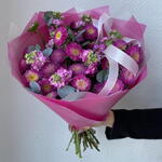 Satin ribbon - 1 pce Eucalyptus - 3 pce Aster - 25 pce matthiola - 7 pce design packaging - 3 pce