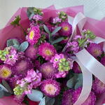 Brighten someones day with the vibrant beauty of our Pink Aster and Matthiola Bouquet. This lively arrangement features the bold and cheerful pink hues of delicate asters, harmoniously paired with the graceful, fragrant blooms of matthiola. Together, they create a stunning display of color and texture, evoking feelings of joy and warmth. Wrapped in elegant designer paper and finished with a soft ribbon, this bouquet is perfect for any occasion that calls for a splash of color and a touch of elegance. Ideal for celebrating special moments or simply bringing a smile to a loved one’s face.