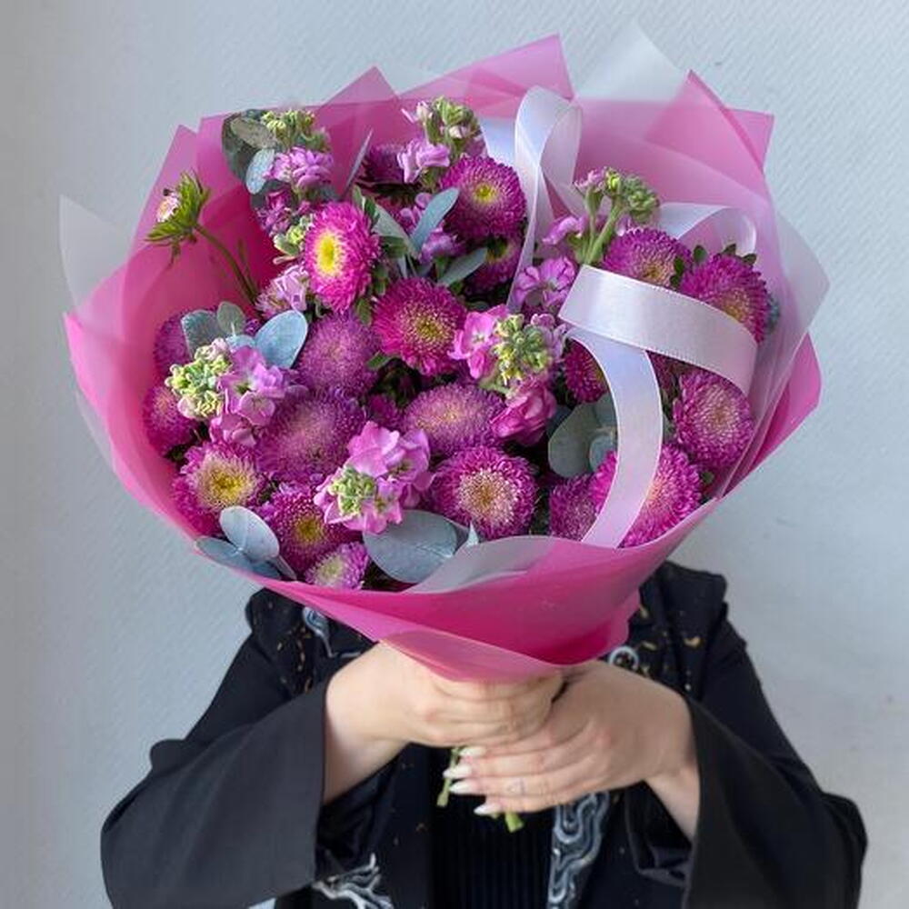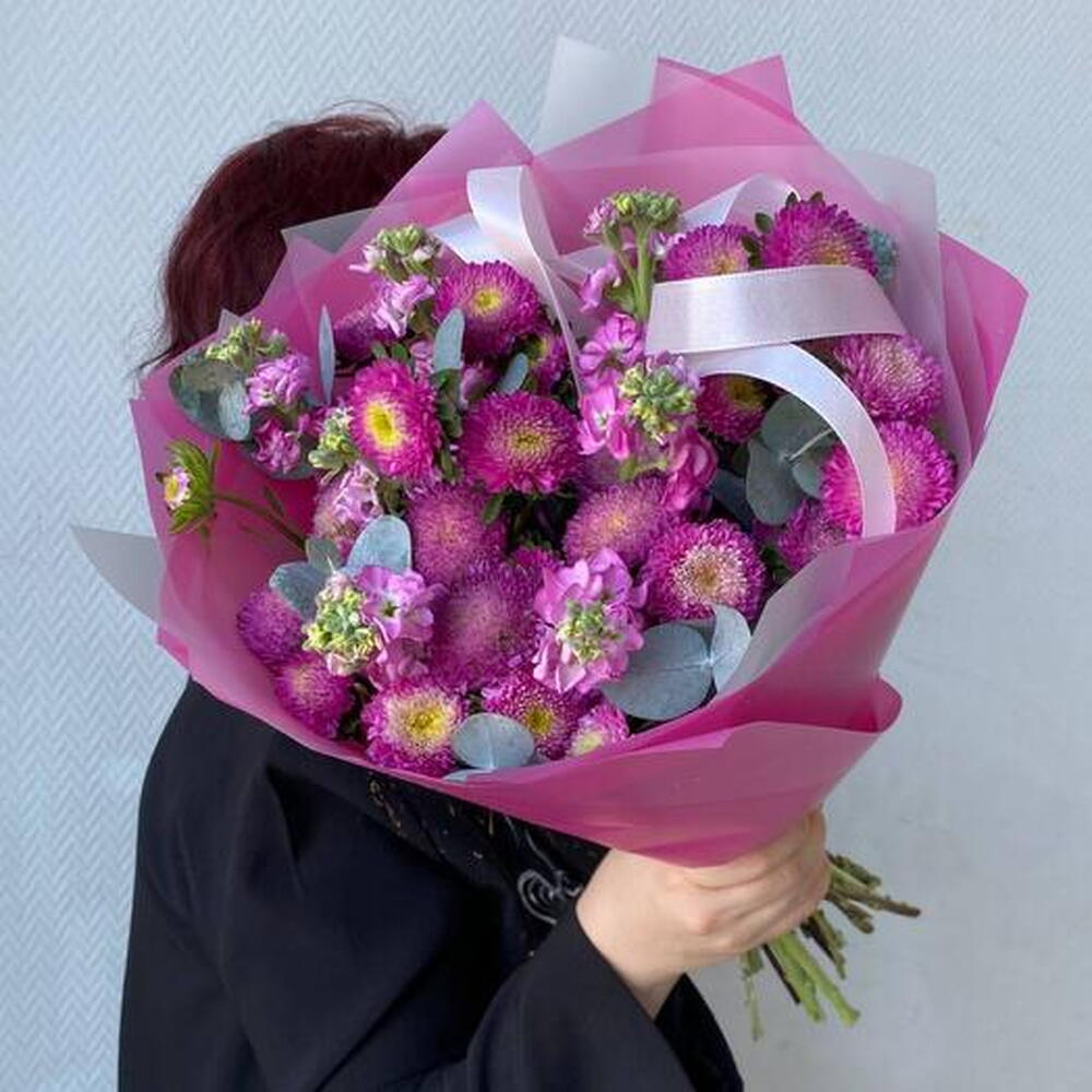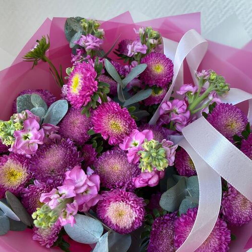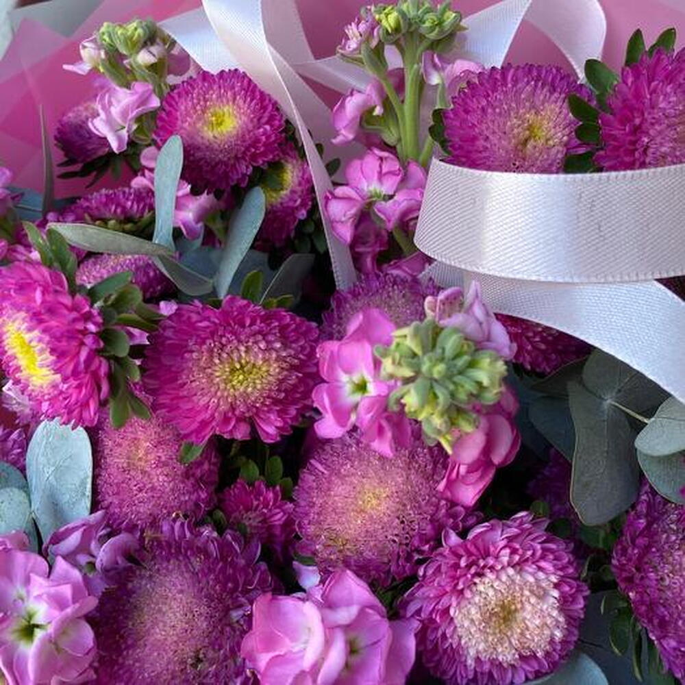 Satin ribbon - 1 pce Eucalyptus - 3 pce Aster - 25 pce matthiola - 7 pce design packaging - 3 pce