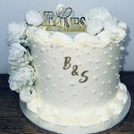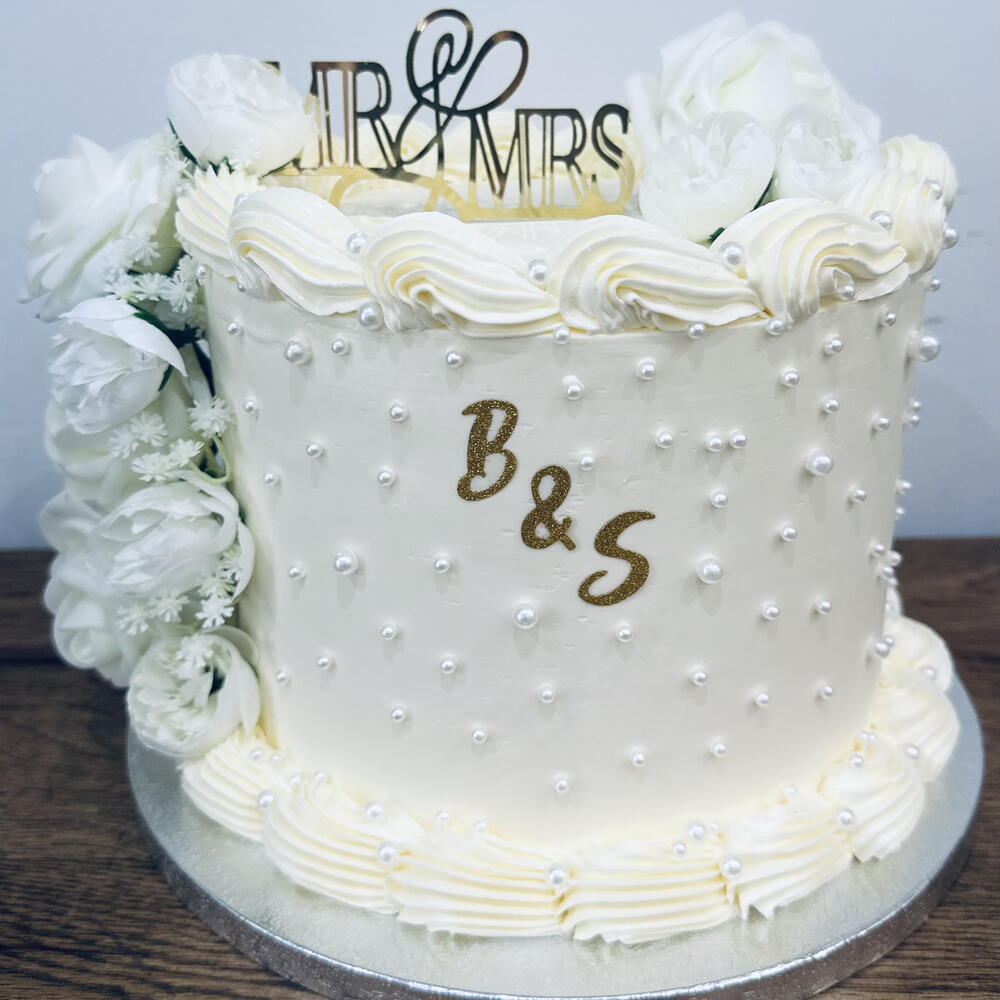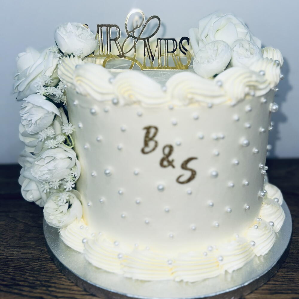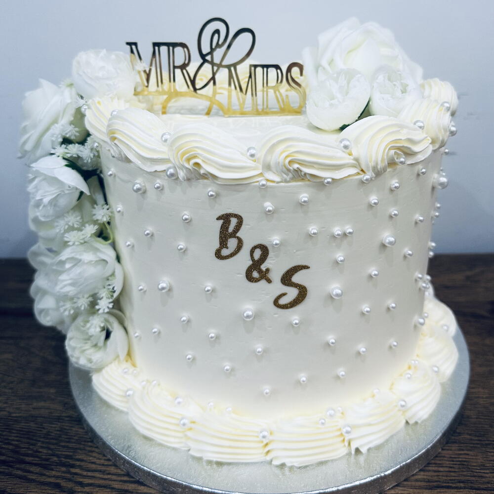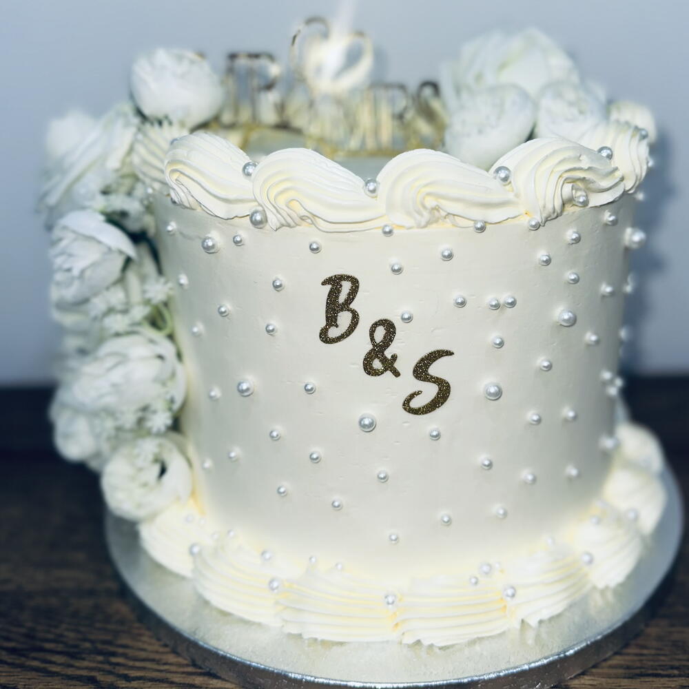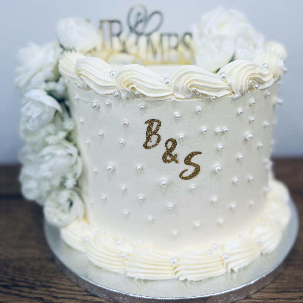 Свадебный торт, украшенный жемчужинами и цветами