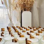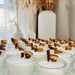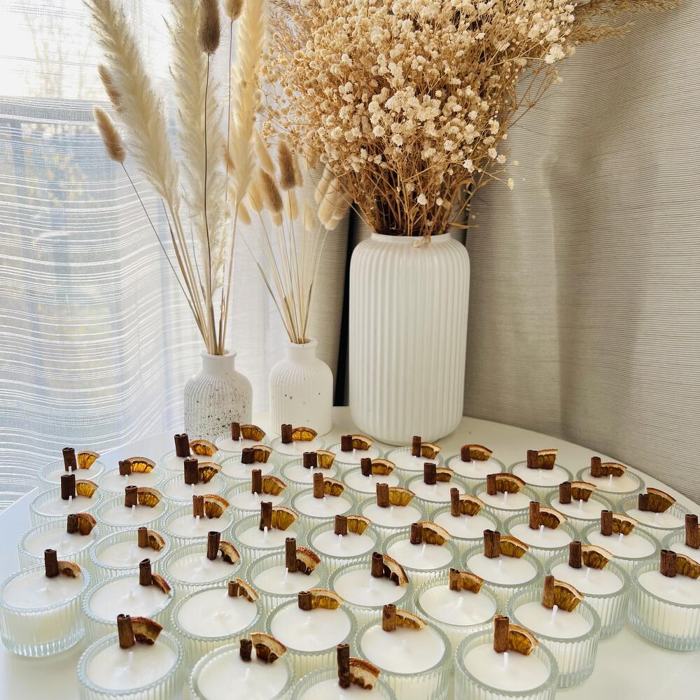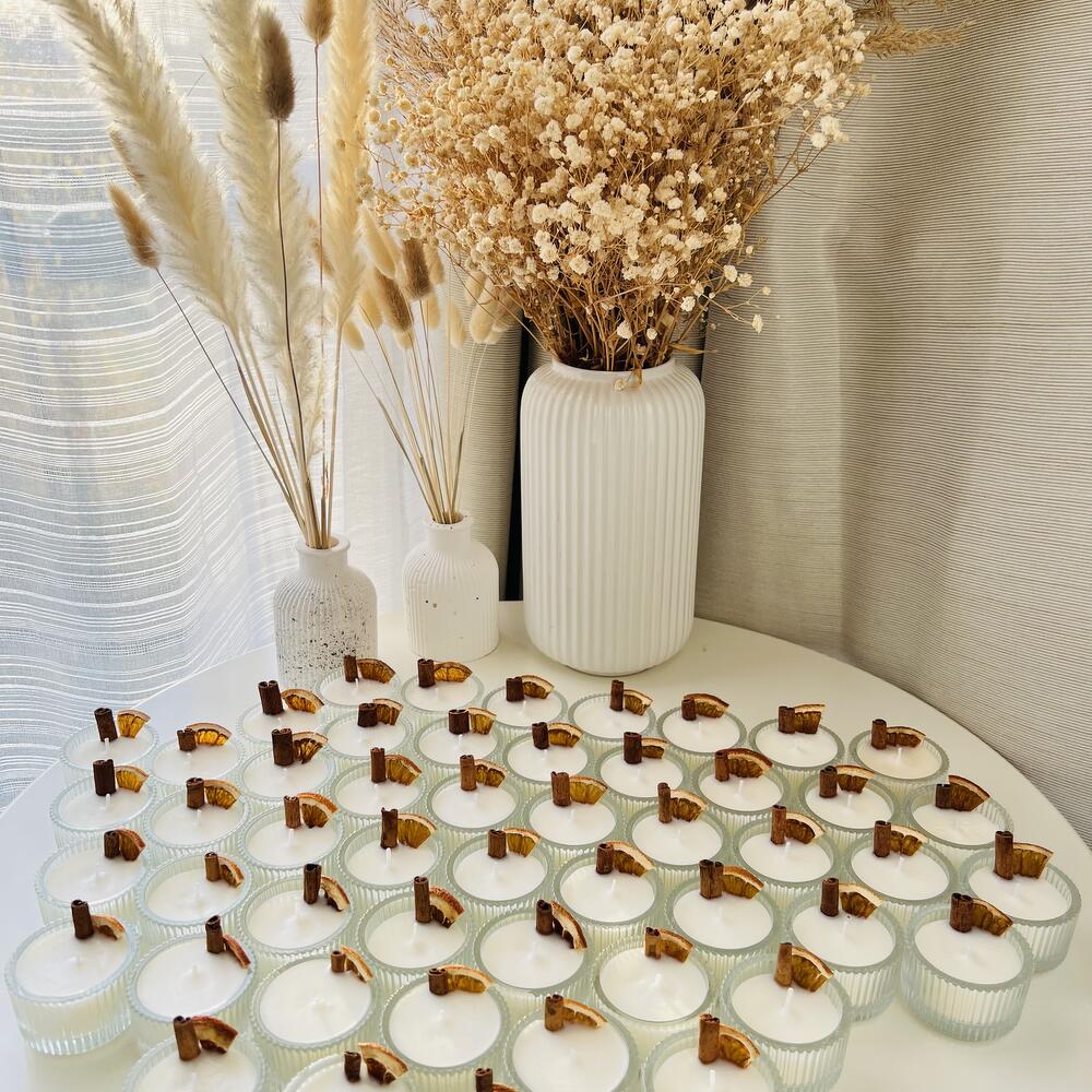 Mini bougies en verre à la cannelle et à lorange. Idéales comme cadeau pour un enterrement de vie de jeune fille, un anniversaire, un baptême ou pour vos clients. Le prix indiqué comprend 50 mini bougies.