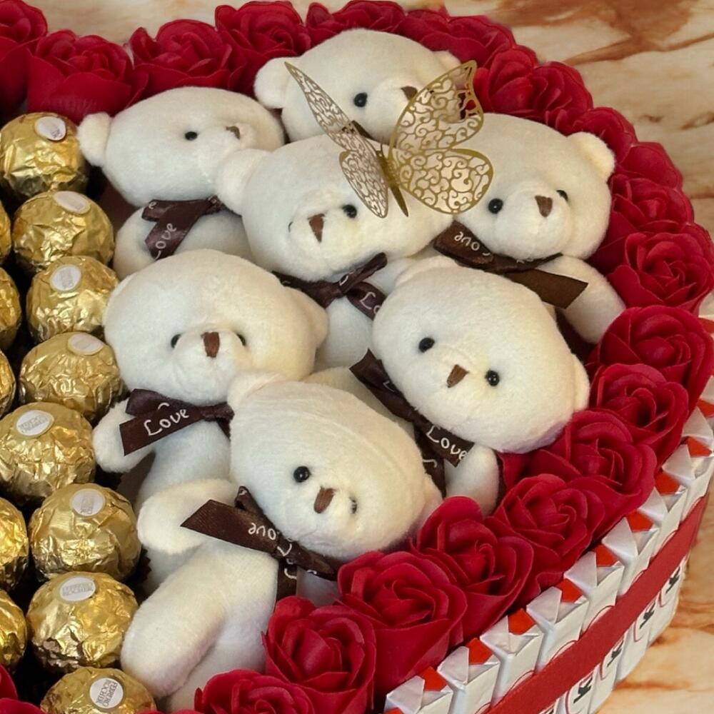 Cette magnifique boîte en forme de cœur est le cadeau idéal pour exprimer votre amour de manière délicate et sucrée. Remplie de délicieux Ferrero Rocher, chaque bouchée est un véritable plaisir pour les papilles. Les adorables petits ours en peluche, portant des rubans Love, ajoutent une touche de tendresse et de charme à cette composition. Les roses rouges fraîchement disposées tout autour apportent une touche de romantisme et de beauté, tandis que le papillon doré et le ruban élégant viennent parfaire lensemble. Ce cadeau est parfait pour la Saint-Valentin, un anniversaire ou toute autre occasion spéciale où vous souhaitez ravir et surprendre lêtre cher. Offrez un moment inoubliable avec ce mélange de douceur, damour et délégance !