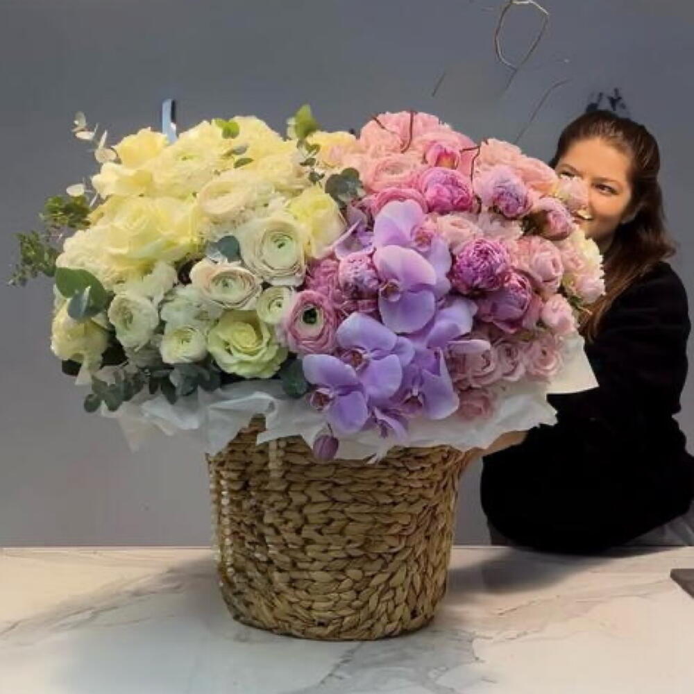 Eucalyptus - 40 шт. Basket - 1 шт. hortensia - 40 шт. Oasis - 8 шт. Orchid - 2 шт. ranunculus - 100 шт. wrapping paper - 10 шт. tree branches - 2 шт. roses - 30 шт.