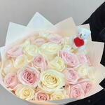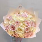 Этот изысканный букет сочетает кремовые и пудрово-розовые розы, создавая мягкую и романтичную гармонию. Пастельные оттенки придают ощущение лёгкости, нежности и вневременной элегантности. Композиция тщательно завернута в деликатную бумагу, которая подчёркивает идеальную округлость букета. Он идеален для дня рождения, признания в любви или особого случая, полного эмоций. Чтобы сохранить свежесть цветов, поместите букет в прохладное место, защищённое от прямого солнца и источников тепла. Меняйте воду каждый день и слегка подрезайте стебли под углом. Удаляйте внешние лепестки при необходимости, чтобы сохранить безупречный вид.