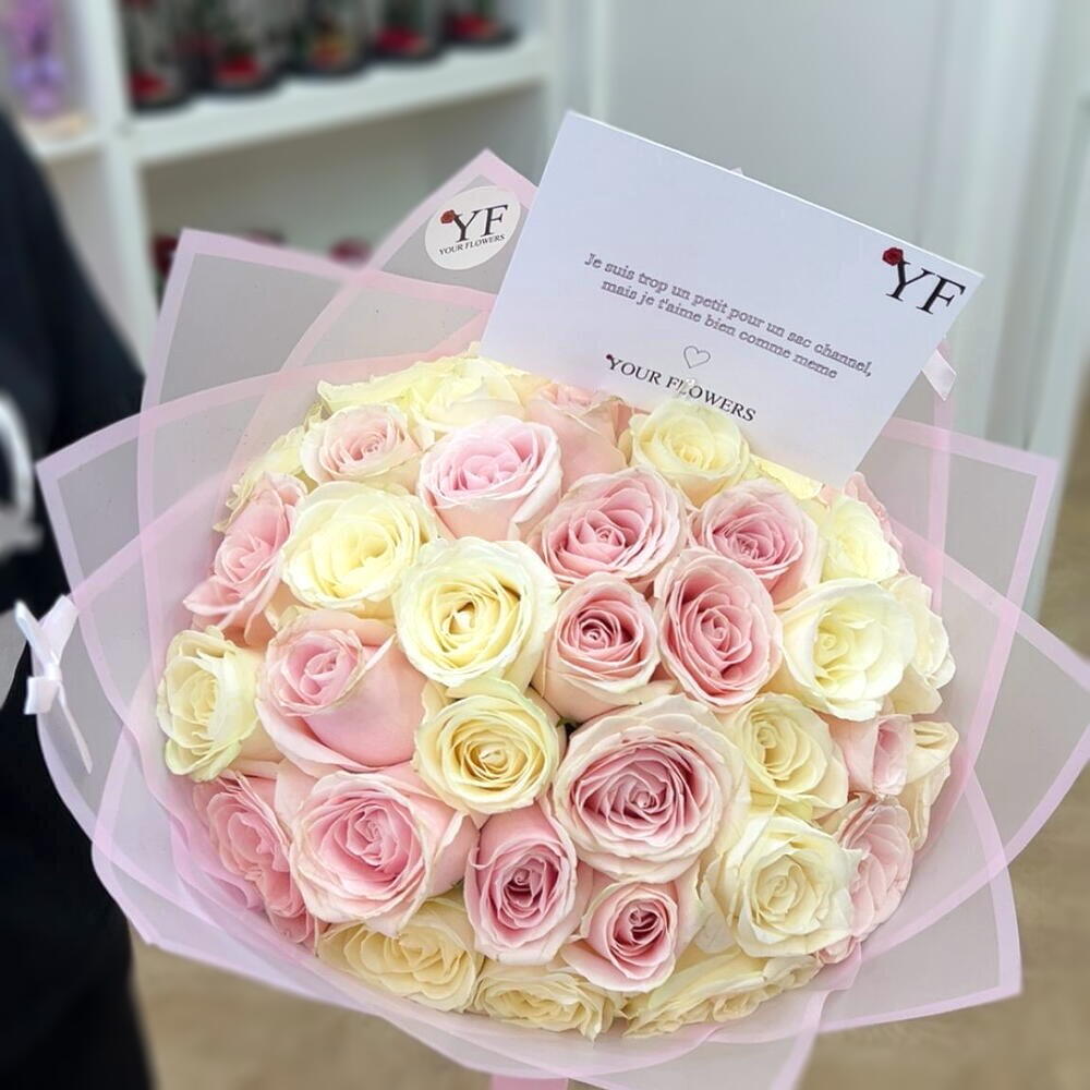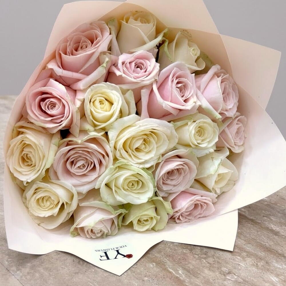 Этот изысканный букет сочетает кремовые и пудрово-розовые розы, создавая мягкую и романтичную гармонию. Пастельные оттенки придают ощущение лёгкости, нежности и вневременной элегантности. Композиция тщательно завернута в деликатную бумагу, которая подчёркивает идеальную округлость букета. Он идеален для дня рождения, признания в любви или особого случая, полного эмоций. Чтобы сохранить свежесть цветов, поместите букет в прохладное место, защищённое от прямого солнца и источников тепла. Меняйте воду каждый день и слегка подрезайте стебли под углом. Удаляйте внешние лепестки при необходимости, чтобы сохранить безупречный вид.