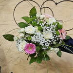Sublimez votre intérieur avec cette magnifique composition Dauteur. Conçu avec un sens artistique raffiné, ce bouquet se compose de 4 pièces de Salal verdoyant, 3 éclatantes Gerbera, 4 pièces pétillantes de Santini, 3 douces Gypsophile, 4 roses blanches pures pour symboliser lamour et la tendresse, et enfin 4 pièces de Lisianthus blanc pour une touche délégance et de sophistication. Une œuvre dart florale qui égaiera vos journées.