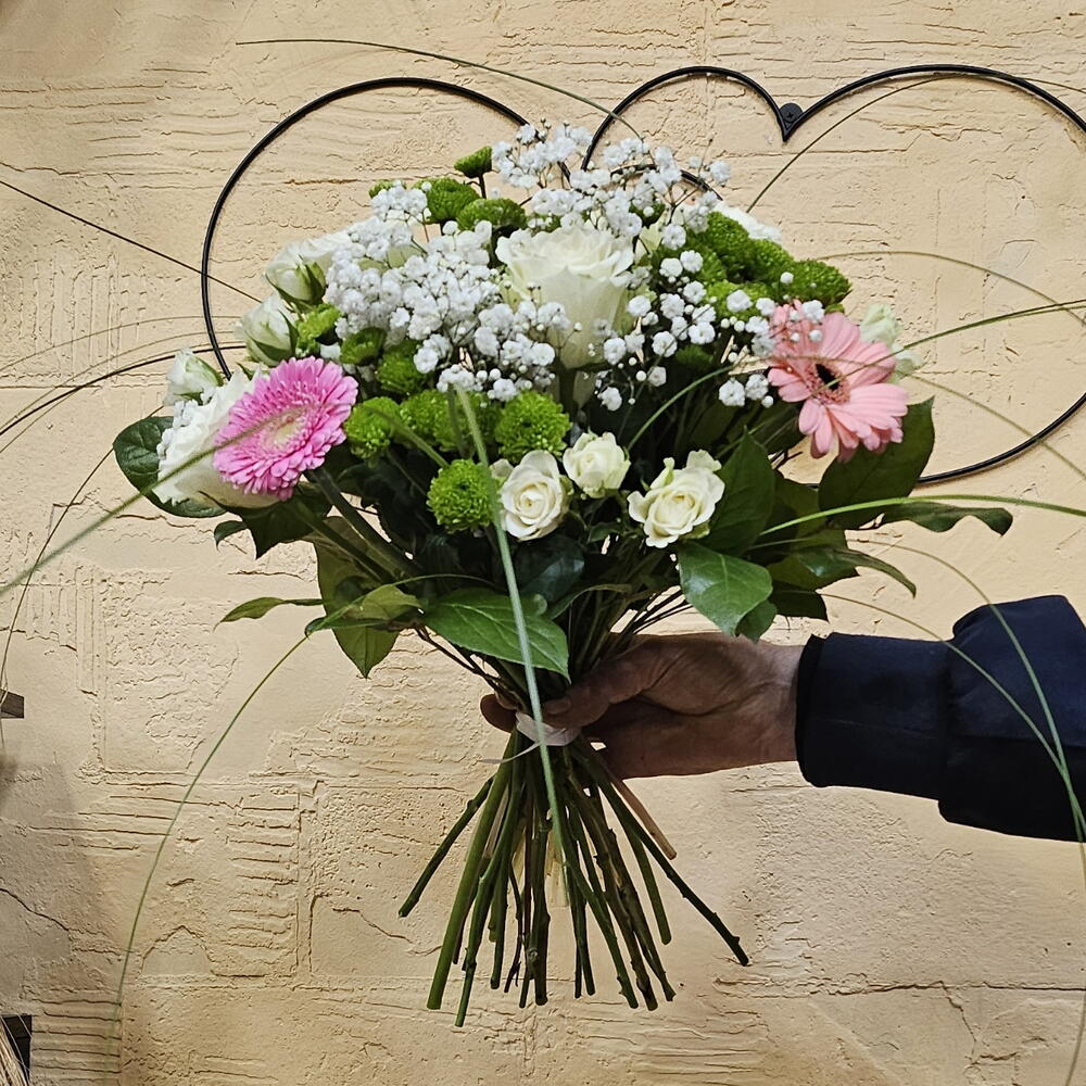 Sublimez votre intérieur avec cette magnifique composition Dauteur. Conçu avec un sens artistique raffiné, ce bouquet se compose de 4 pièces de Salal verdoyant, 3 éclatantes Gerbera, 4 pièces pétillantes de Santini, 3 douces Gypsophile, 4 roses blanches pures pour symboliser lamour et la tendresse, et enfin 4 pièces de Lisianthus blanc pour une touche délégance et de sophistication. Une œuvre dart florale qui égaiera vos journées.