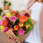 Букет разноцветных роз, собранный с гармоничной зеленью и дизайнерской упаковкой.