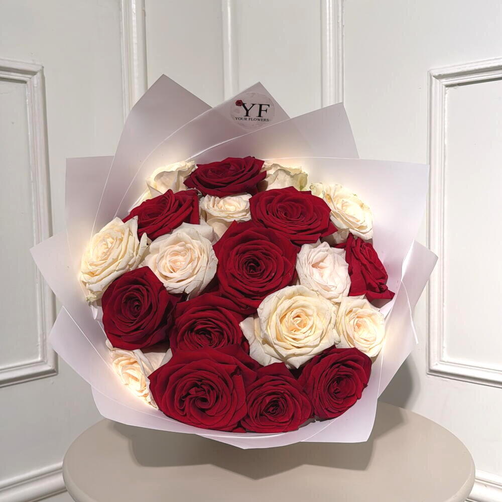Ce bouquet élégant de roses rouges et ivoire séduit par son contraste raffiné et son allure intemporelle. Il exprime à la fois la passion, la tendresse et l’élégance, faisant de lui un choix parfait pour transmettre des émotions sincères. Idéal pour un anniversaire, une déclaration d’amour, la Saint-Valentin, un anniversaire de mariage ou une occasion spéciale, il attire immédiatement le regard. Les fleurs sont fraîches et soigneusement sélectionnées pour garantir une belle tenue. Pour prolonger leur beauté, il est conseillé de changer l’eau tous les deux jours, de recouper les tiges en biais et de retirer les feuilles immergées. Évitez la chaleur directe, le soleil et les courants d’air afin de préserver la fraîcheur du bouquet.