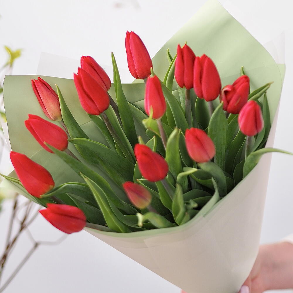 Un magnifique bouquet de 15 tulipes rouge profond, rayonnant de chaleur, de romantisme et d’affection sincère. Les fleurs généreuses forment une composition harmonieuse qui attire immédiatement le regard. Soigneusement enveloppé dans un papier élégant et agrémenté de feuillage frais, ce bouquet est un cadeau parfait pour les anniversaires, les moments romantiques ou simplement pour illuminer la journée de quelqu’un avec une touche d’amour.