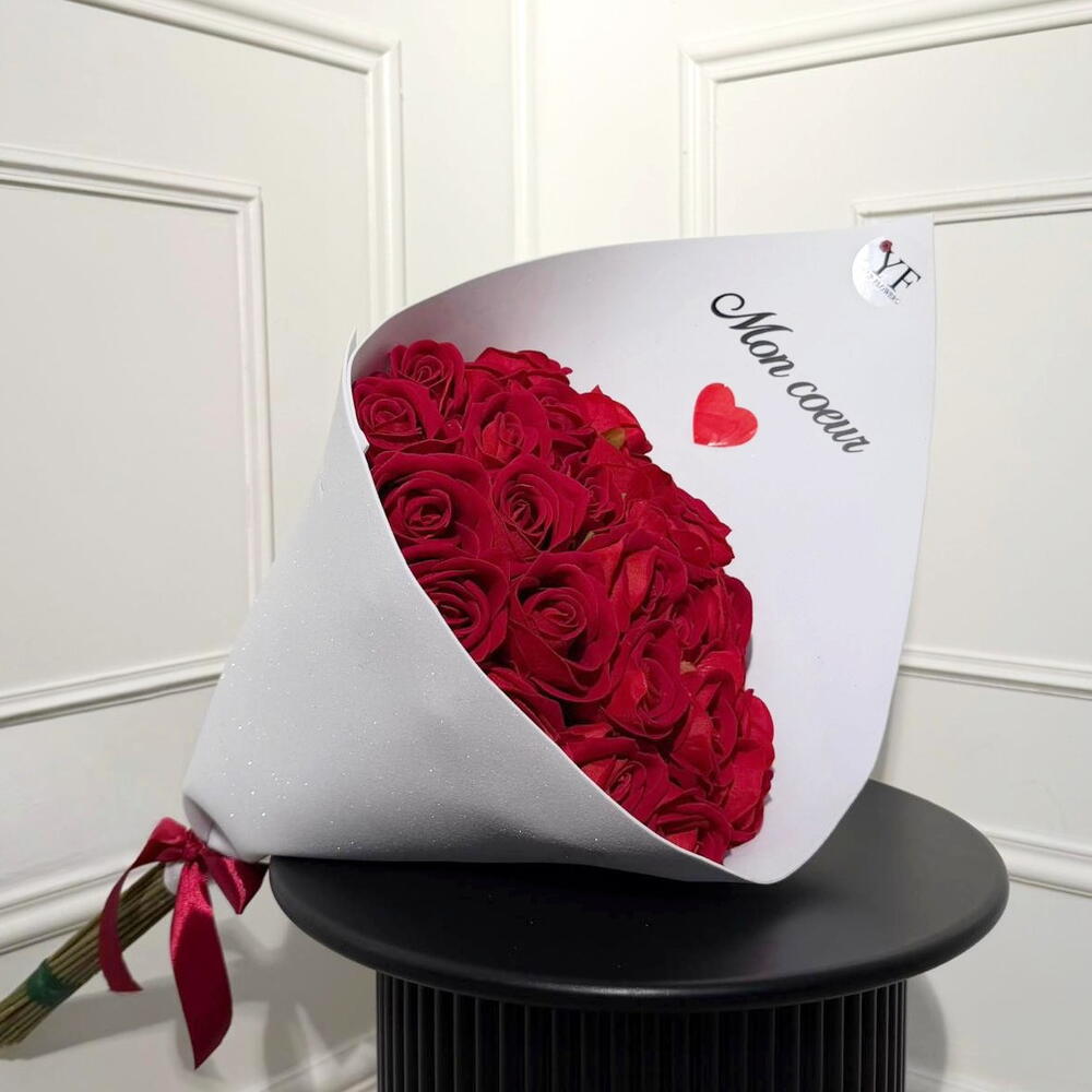 Этот изысканный букет красных роз воплощает элегантное и вневременное признание в любви. Завернутый в нежную белую бумагу с блестками и украшенный надписью «Мое сердце», он выражает глубокие чувства с нежностью и интенсивностью. Тщательно расположенные розы создают щедрую и гармоничную форму, которая сразу же привлекает внимание. Этот букет идеально подходит для романтического случая: годовщины, признания в любви, Дня святого Валентина или любого особого момента для двоих. Его лаконичный и шикарный стиль делает его подходящим как для классического подарка, так и для современного сюрприза. Для продления свежести цветов рекомендуется подрезать стебли под углом каждые два дня, ежедневно менять воду и размещать букет в прохладном месте, вдали от прямых солнечных лучей и источников тепла.