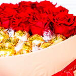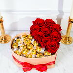 A luxurious heart-shaped gift box featuring an elegant combination of premium red roses and gourmet chocolates. One half of the box is filled with beautifully arranged, vibrant red roses, carefully selected for their freshness and rich color, while the other half is filled with delicious gold-wrapped chocolates. The arrangement is presented in a refined beige box, delicately finished with a red ribbon, creating a perfect balance of romance and sophistication. Ideal for special occasions such as Valentine’s Day, anniversaries, or as a thoughtful gift to express love and appreciation.