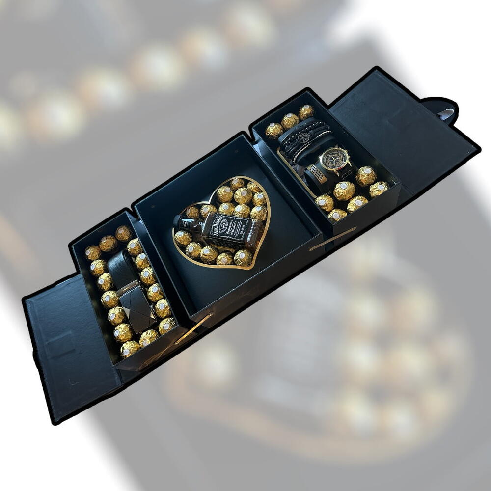 Offrez un mélange de style et de raffinement dans un seul coffret ! Ce coffret cadeau pour homme a été conçu pour impressionner et ravir. Il contient : • Une mini-bouteille de whisky Jack Daniel’s – pour les amateurs de spiritueux • Des accessoires élégants : montre, bracelets et ceinture – pour un look masculin et sophistiqué • 32 chocolats Ferrero Rocher – une touche sucrée de luxe Un cadeau parfait pour un anniversaire, la Saint-Valentin, la fête des pères ou toute autre occasion spéciale.