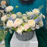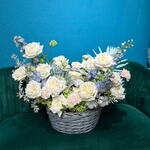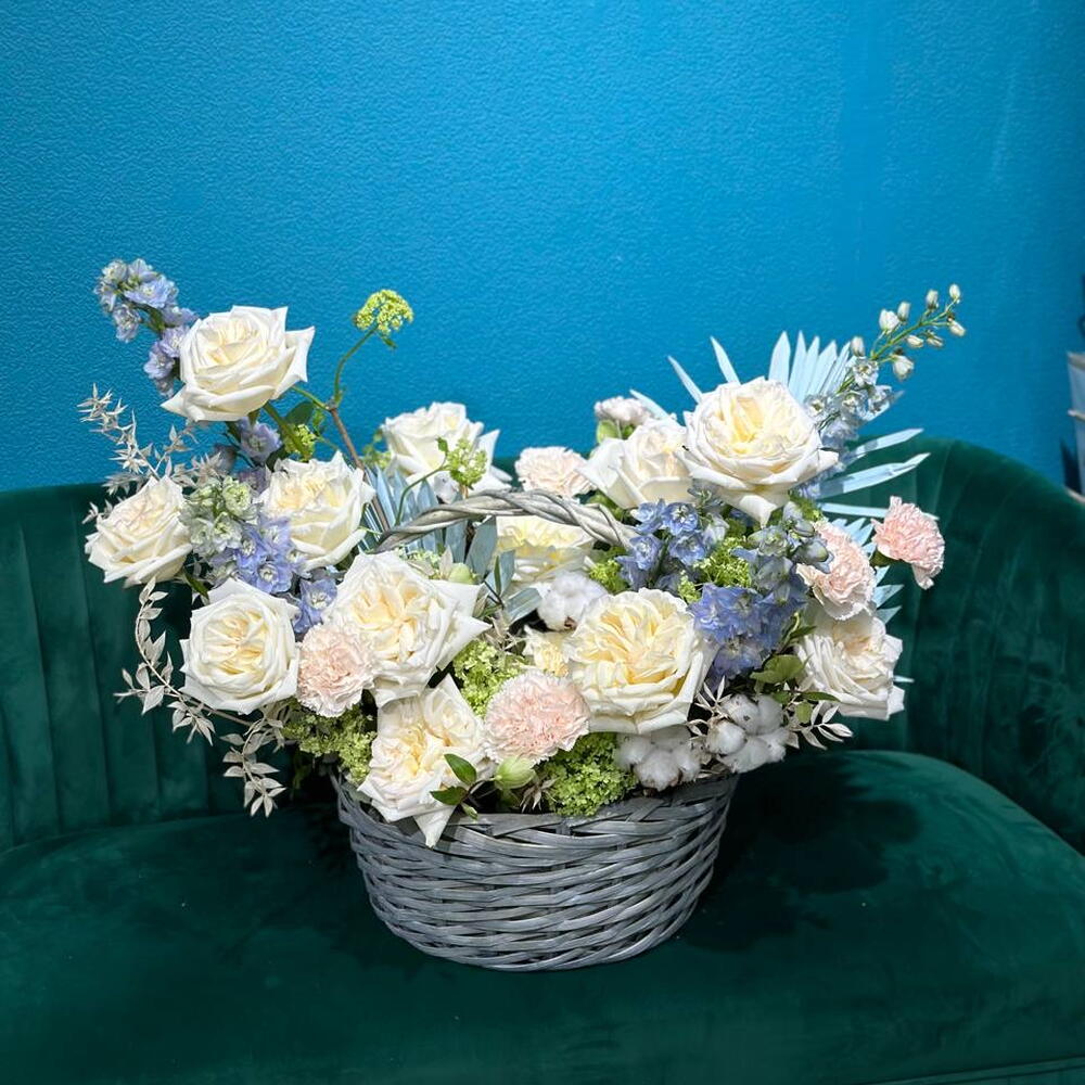 A dreamy composition of soft elegance—this grand flower basket blends fluffy cotton, delicate white roses, ruscus, airy delphinium, and charming dianthus, accented with palm branches for a touch of natural grace. With light hues, soft greens, and a whisper of lilac, this arrangement exudes serenity, sweetness, and timeless beauty