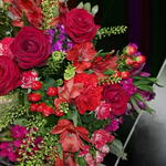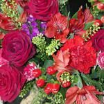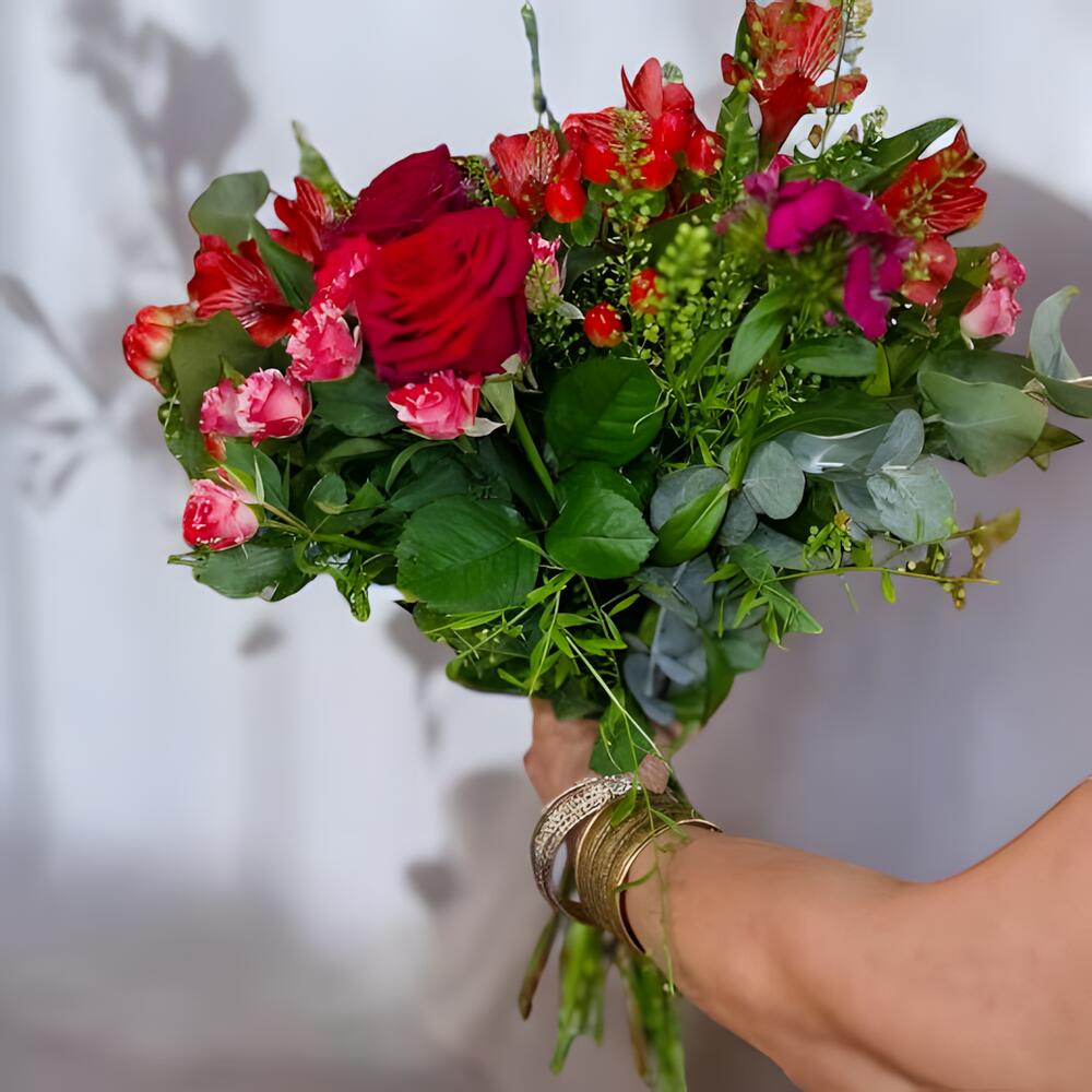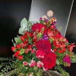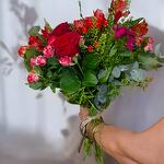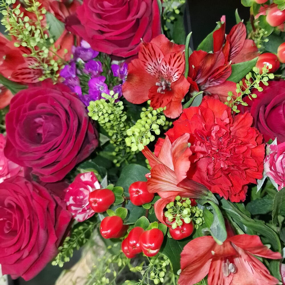 Eucalyptus - 10 шт. Limonium - 5 шт. Alstroemeria - 5 шт. hypericum - 3 шт. rose rouge - 10 шт. taspli - 3 шт. rose branchue - 5 шт.