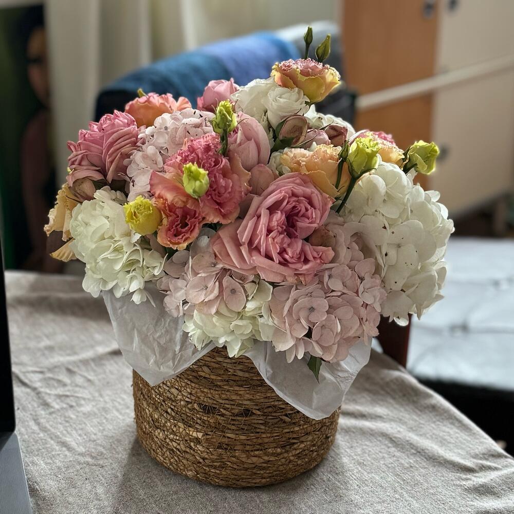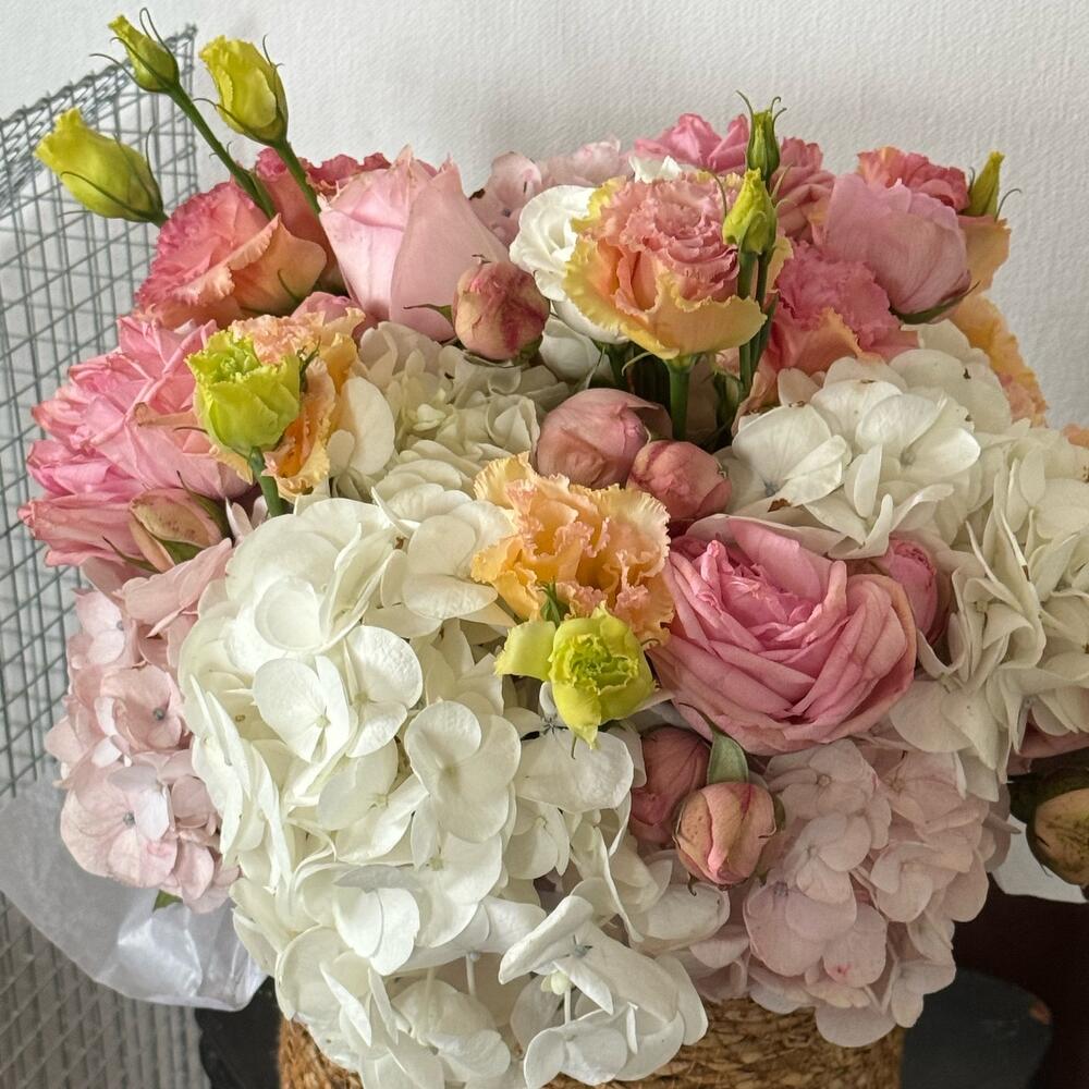 Basket - 1 шт. hortensia - 2 шт. Lisianthus - 5 шт. roses - 8 шт.