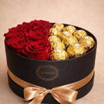 Элегантное и изысканное творение, состоящее из 8 стабилизированных красных роз и 13 конфет Ferrero Rocher, символа страсти и сильной любви, в сочетании с нежными золотыми капсулами Ferrero Rocher, создающими неотразимое ощущение изысканности и роскоши. Срок службы: Стабилизированные розы сохраняют свою красоту от 3 до 5 лет без какого-либо ухода, сохраняя при этом свою первоначальную форму и сияние. • Инструкции по уходу Для сохранения их полного великолепия: • Хранить вдали от влаги • Избегать прямого воздействия света и солнечных лучей • Не поливать