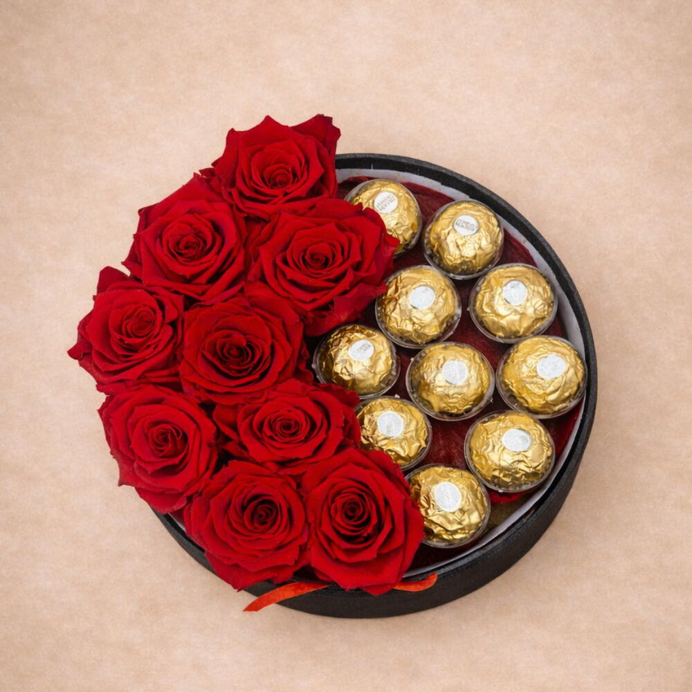 Элегантное и изысканное творение, состоящее из 8 стабилизированных красных роз и 13 конфет Ferrero Rocher, символа страсти и сильной любви, в сочетании с нежными золотыми капсулами Ferrero Rocher, создающими неотразимое ощущение изысканности и роскоши. Срок службы: Стабилизированные розы сохраняют свою красоту от 3 до 5 лет без какого-либо ухода, сохраняя при этом свою первоначальную форму и сияние. • Инструкции по уходу Для сохранения их полного великолепия: • Хранить вдали от влаги • Избегать прямого воздействия света и солнечных лучей • Не поливать