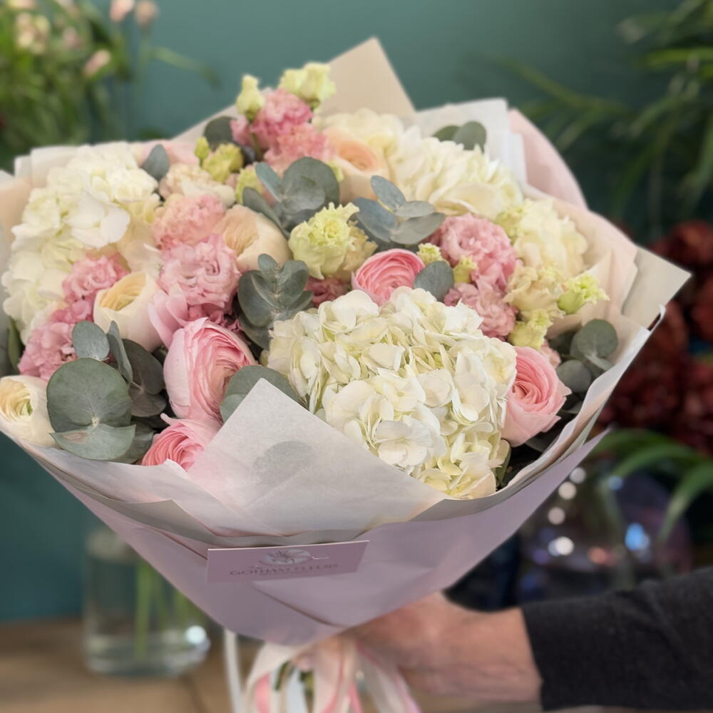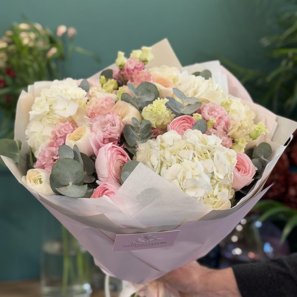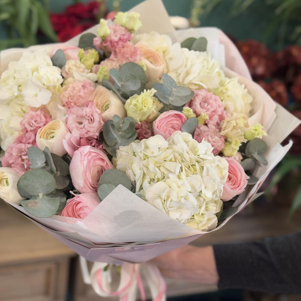 Eucalyptus - 1 шт. hortensia - 1 шт. renoncule - 1 шт. lisianthys - 1 шт.