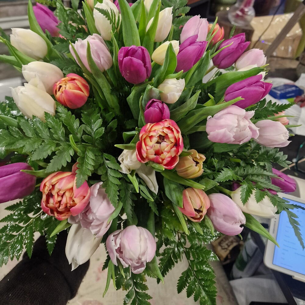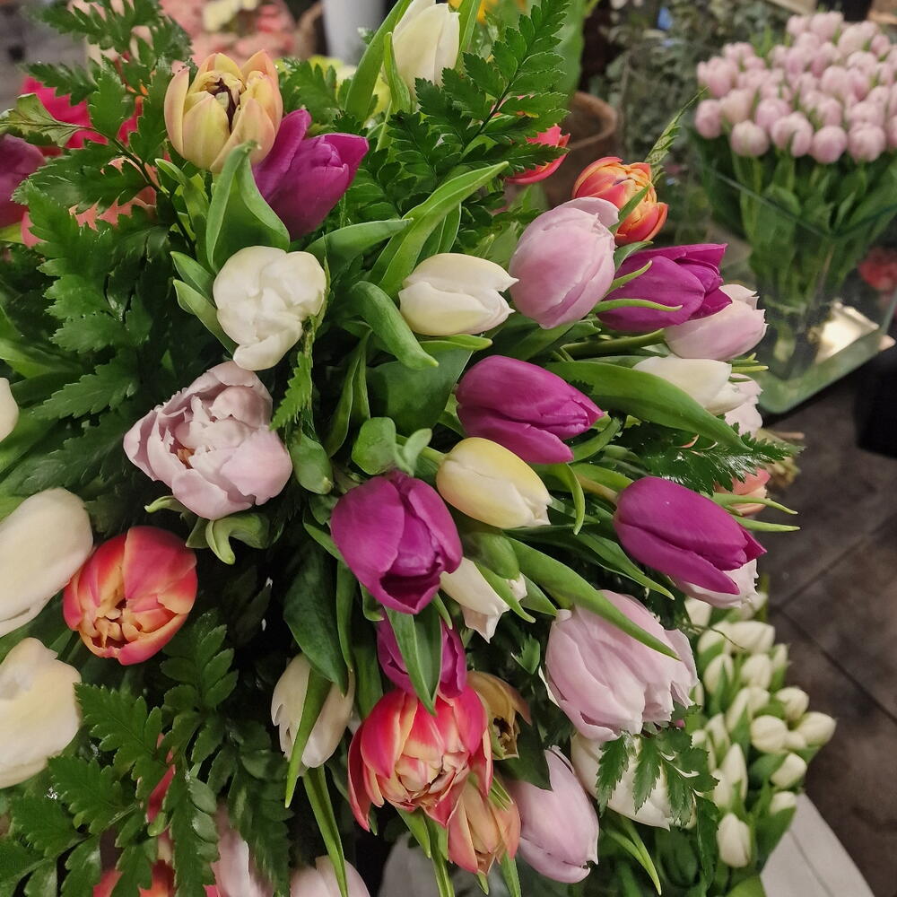 подарить букет тюльпанов смешанных цветов часто выражает чувство восхищения. Но, в зависимости от его композиции, он также может означать игру соблазнения между вами и человеком, которому дарят букет.