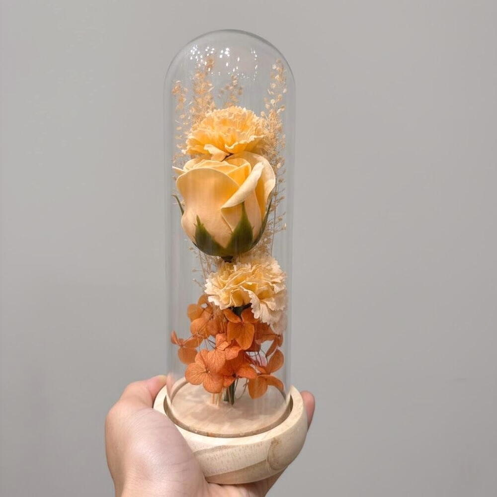 Эта элегантная композиция под стеклянным куполом демонстрирует стабилизированную розу в мягких, теплых тонах, дополненную нежными сухоцветами. Представленная на подставке из натурального дерева, она добавит нотку поэзии и изысканности любому интерьеру. Благодаря процессу консервации, роза сохраняет свою красоту долгие годы без полива. Это идеальный подарок на день рождения, День святого Валентина, День матери, для украшения офиса или как символический сувенир, наполненный эмоциями. Для сохранения ее блеска рекомендуется не открывать купол и избегать прямых солнечных лучей. Особого ухода не требуется, что делает ее декоративным предметом, столь же долговечным, сколь и элегантным.