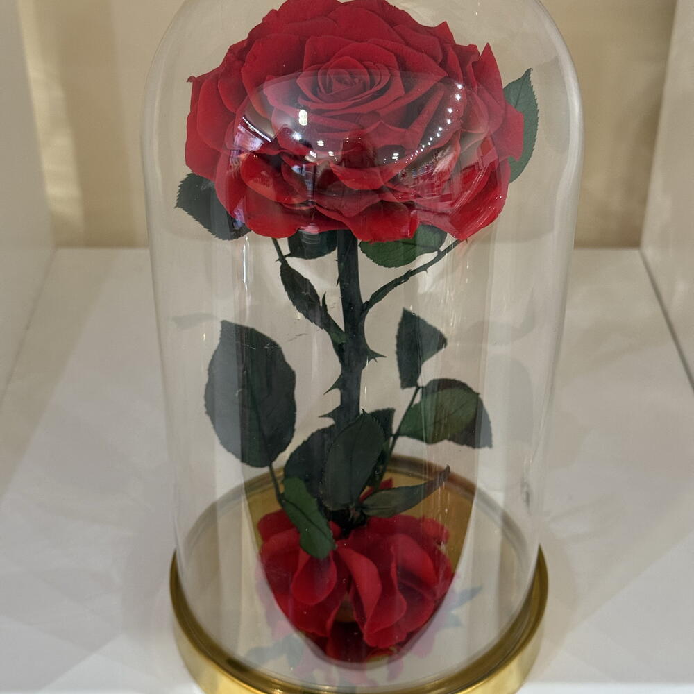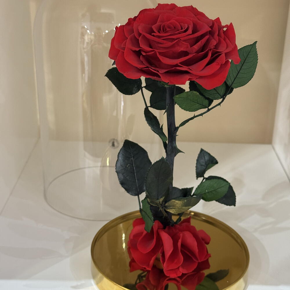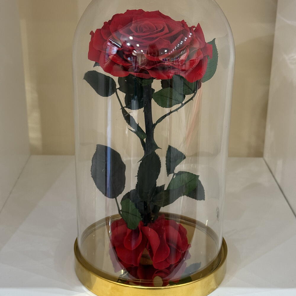 Rose Éternelle Sous Cloche - Inspiration “La Belle et la Bête” Ajoutez une touche de magie et d’élégance à votre intérieur avec cette magnifique rose éternelle sous cloche. Inspirée du conte classique La Belle et la Bête, cette rose rouge éclatante symbolise l’amour éternel et la beauté intemporelle. • Matériau : Rose artificielle de haute qualité avec des pétales en tissu réaliste. • Base : Plateau doré raffiné pour une touche luxueuse. • Cloche en verre : Protection élégante pour préserver l’éclat de la rose. • Design unique : Effet enchanteur avec des pétales tombants, recréant la célèbre scène du conte. Parfaite comme décoration romantique ou cadeau spécial pour un être cher, cette rose éternelle est un symbole d’amour et d’élégance intemporelle.