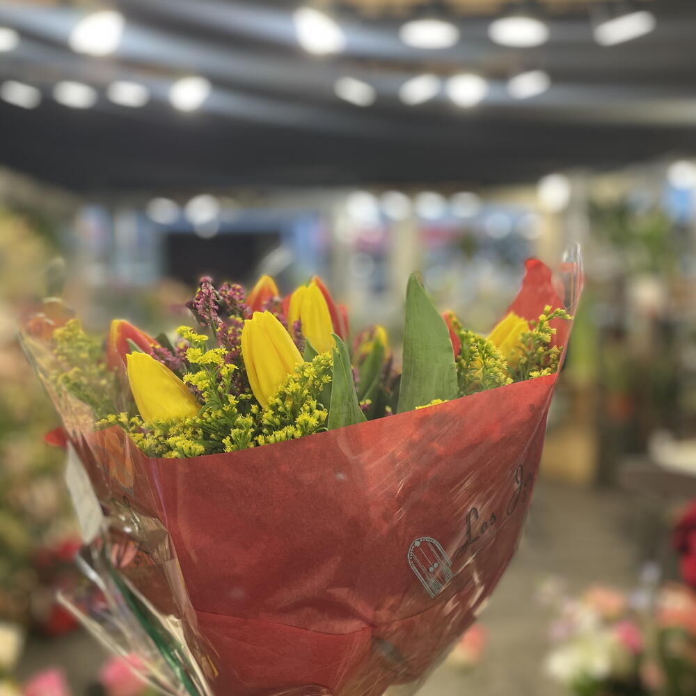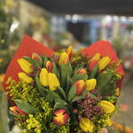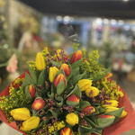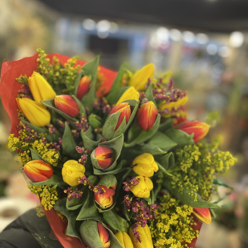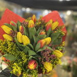 Limonium - 5 шт. solidago yellow - 5 шт. feuillage - 5 шт. tulipes rouge/orange - 10 шт. tulipes jaunes - 10 шт.