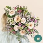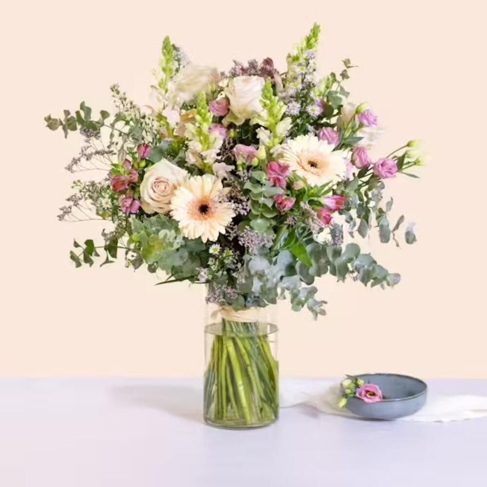 Alstroemeria - 7 шт. rose - 7 шт. germini - 5 шт. gipsofila - 5 шт. aucaliptus - 7 шт. emballage cadeau - 5 шт. ruban satiné - 3 шт. luntisque - 5 шт.