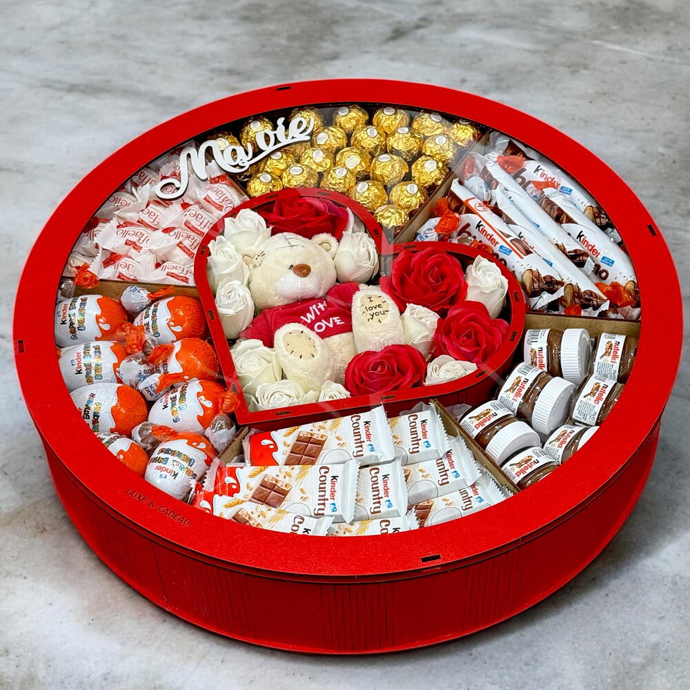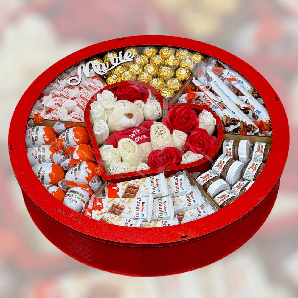 Kinder Surprise - 8 шт. Raffaello - 15 шт. Ferrero rocher - 21 шт. bueno - 5 шт. schoko bons - 20 шт. country - 9 шт. mini nutella - 8 шт. fleurs de savon - 21 шт. teddy peluche 15 cm - 1 шт.