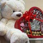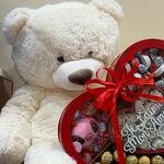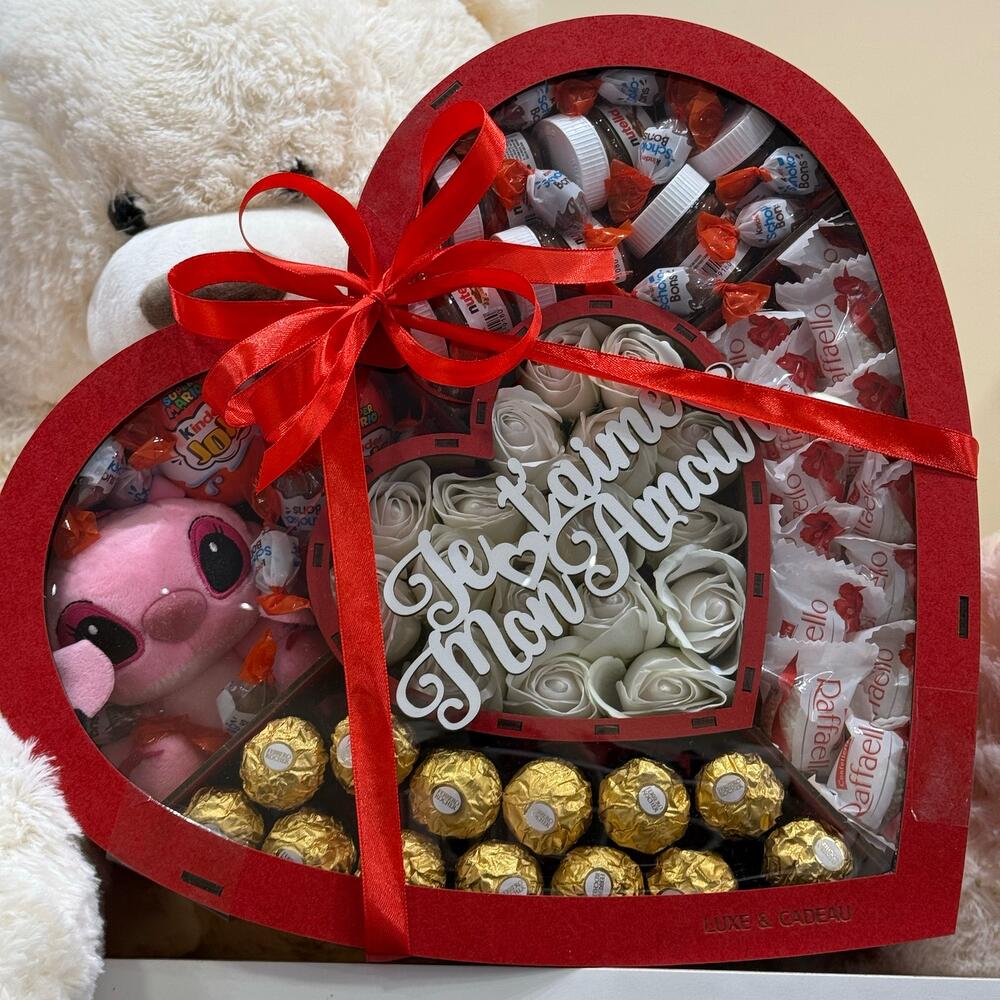 Kinder Surprise - 2 шт. Raffaello - 13 шт. Ferrero rocher - 13 шт. nutella mini 25g - 5 шт. shcoko bons - 15 шт. stitch 12 cm - 1 шт. rose de savon - 15 шт. grande nounours 100cm - 1 шт.