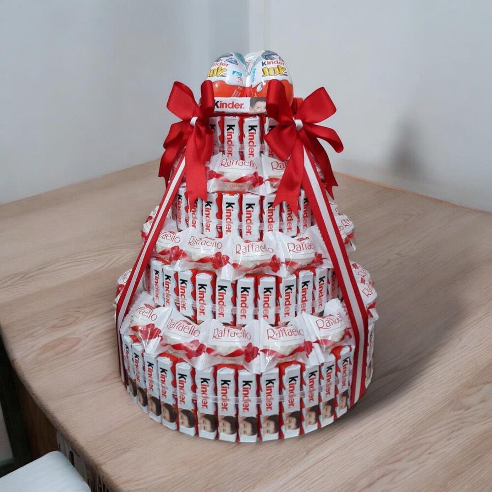 Cette pyramide délicieuse de bonbons Kinder et Raffaello est un cadeau parfait pour les amateurs de douceurs. Chaque étage est soigneusement décoré avec des paquets soigneusement alignés, créant un effet visuel époustouflant. Les rubans rouges ajoutent une touche élégante, transformant cette création en un cadeau festif et raffiné. Que ce soit pour un anniversaire, une célébration ou un moment spécial, cette pyramide sucrée saura ravir les gourmands de tous âges. Offrez un cadeau à la fois gourmand et original qui fera sensation à coup sûr. La combinaison de chocolat Kinder et de délicats Raffaello est un véritable délice pour les papilles. Un incontournable pour toute occasion joyeuse !