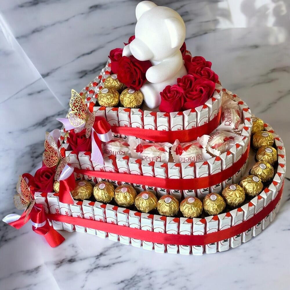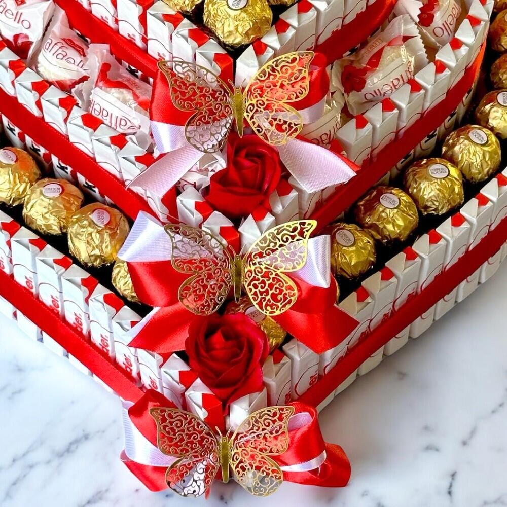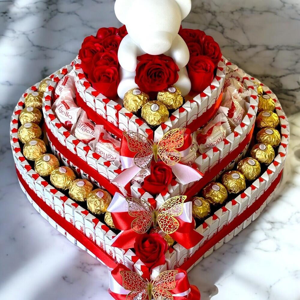 Cette pyramide en forme de cœur est un cadeau irrésistible pour ceux qui souhaitent offrir un moment sucré et romantique. Chaque étage est décoré de délicieuses friandises Ferrero Rocher et de douceurs Raffaello, créant une explosion de saveurs et de couleurs. Les roses rouges ajoutent une touche de passion, tandis que ladorable ourson blanc au sommet apporte une touche de tendresse. Les rubans rouges et blancs, ainsi que les papillons dorés, ajoutent une note de sophistication et de raffinement à cette création. Parfait pour la Saint-Valentin, un anniversaire ou toute autre occasion spéciale, ce cadeau fera fondre le cœur de celui ou celle qui le recevra. Offrez ce symbole damour et de gourmandise pour un moment inoubliable ! Kinder/ Ferrero Rocher/ Raffaello / fleur de savon / ourson avec rose stabilisé Taille : 1ere étage 40cm*40cm 2ème étages 30cm*30cm 3ème étagés 20cm*20cm