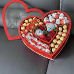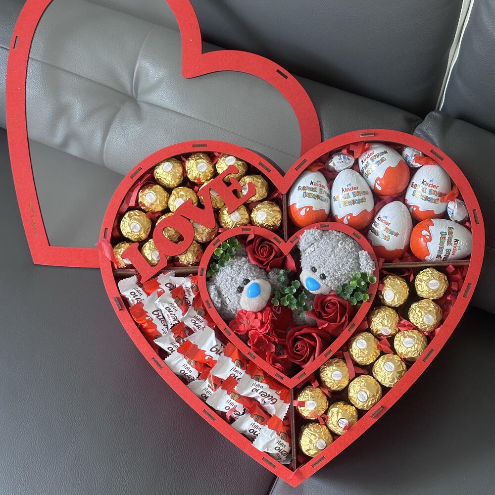 Taille 40cm*40cm*15cm Boîte en bois Chocolaté : Ferrero Rocher , Kinder surprise , schoco bons , mini bueno , 2 nounours 15 cm , fleurs de savon