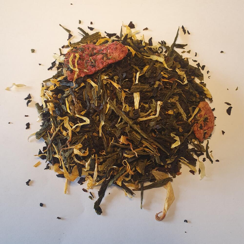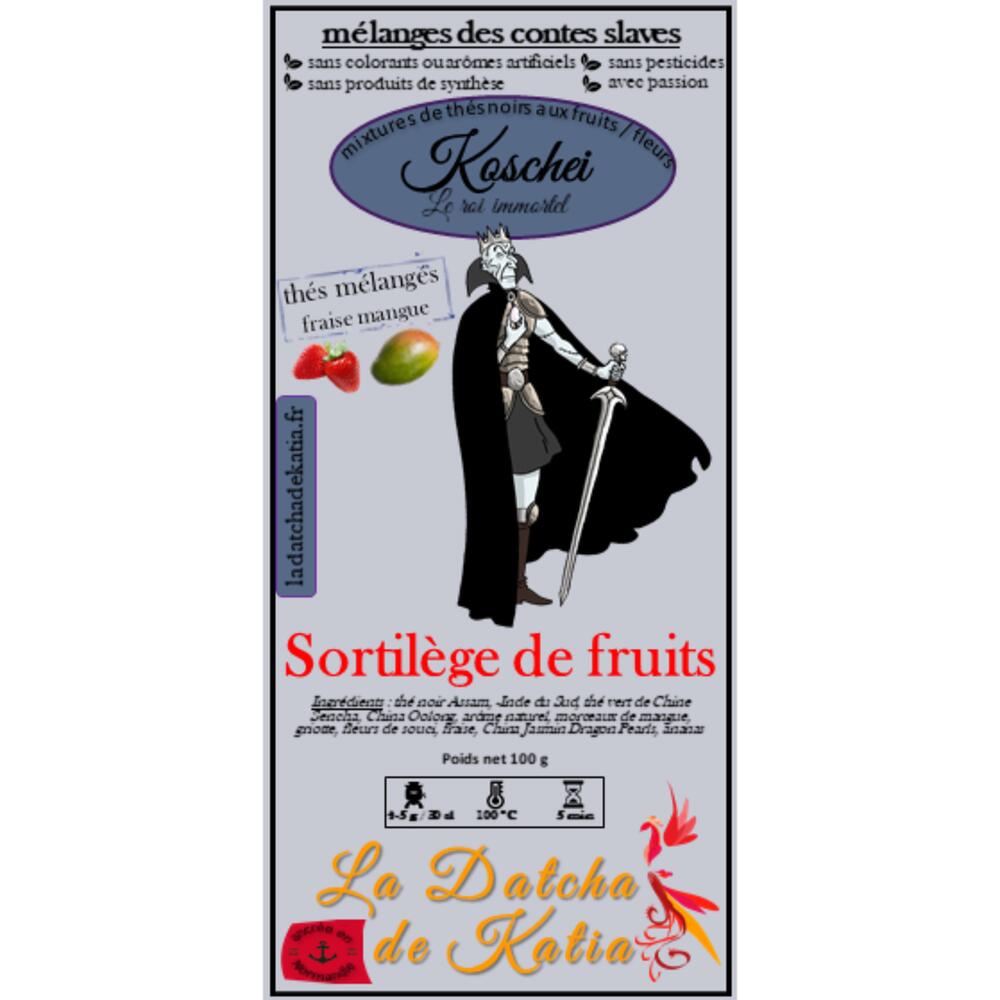 On peut ne plus être jeune...et rester séduisant ! C’est ce que pense Koschei de lui-même, Mesdames, en vous offrant ce bouquet de fruits en signe de sa profonde admiration. Si vous n’êtes pas convaincue, le roi-sorcier vous enlèvera et vous enfermera...et à vous la « vie de château »... Ingrédients : thé noir Assam, -Inde du Sud, thé vert de Chine Sencha, China Oolong, arôme naturel, morceaux de mangue, griotte, fleurs de souci, fraise, China Jasmin Dragon Pearls, ananas