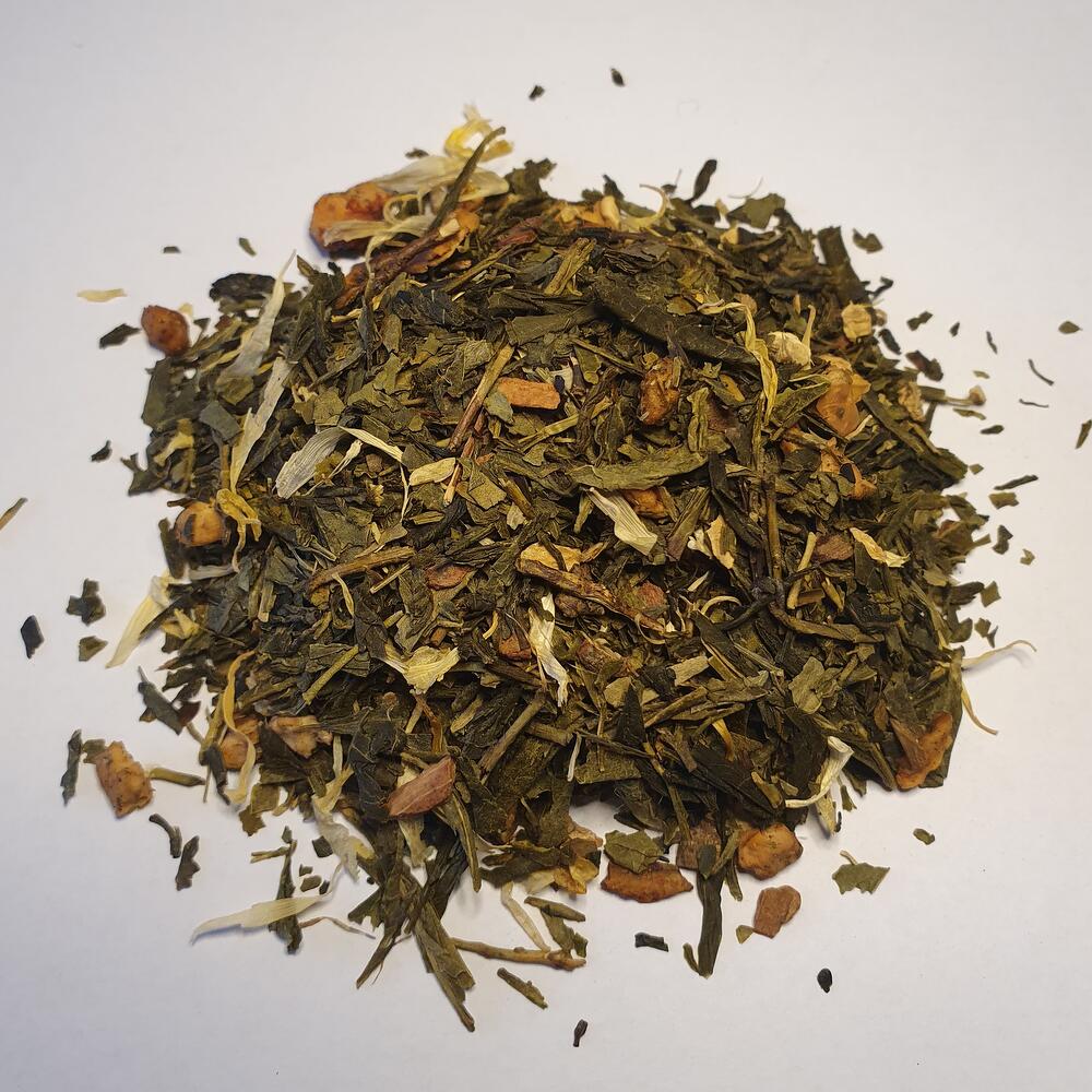 Thé vert gourmand à la crème d'amandes Ingrédients : thé vert de Chine Sencha, pomme, bâtons de cannelle, gingembre, arome naturel, fleurs de souci, vanille